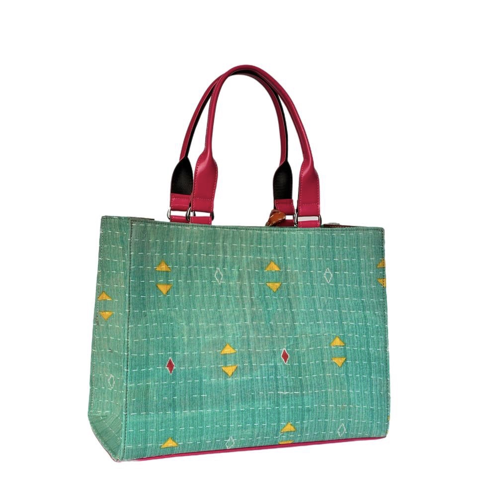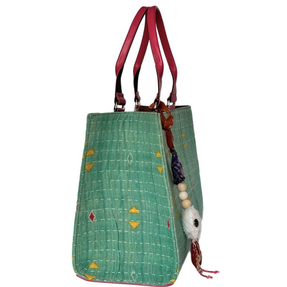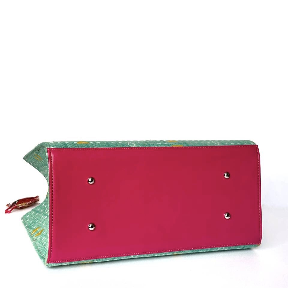 توت بگ با پارچه کوک دوزی که برای دسته ازچرم مصنوعی ترک استفاده شده وباکیبل دستدوز تزیین شده است و در کیف به وسیله دکمه بسته می شود وهمچنین داخل کیف یک جیب دارد.
