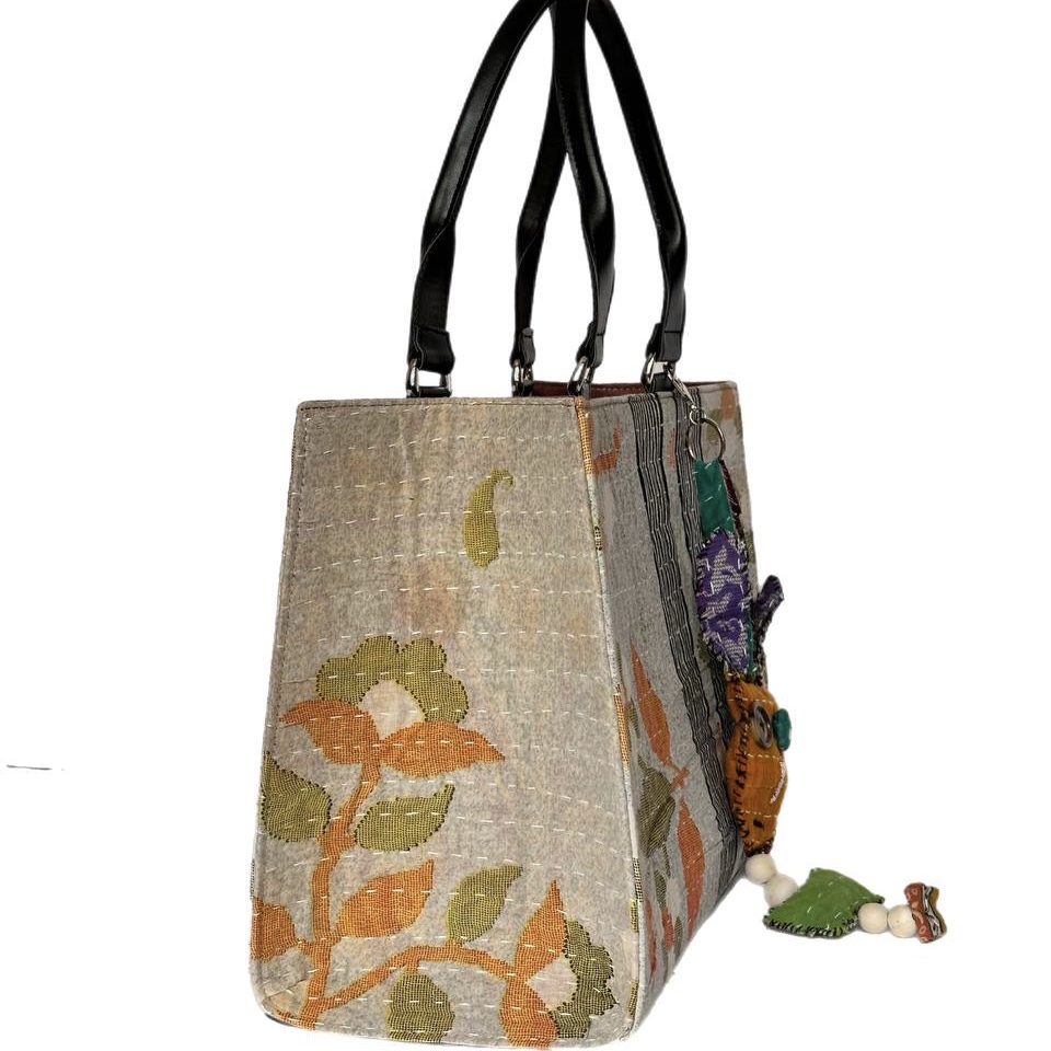 توت بگ با پارچه کوک دوزی که برای دسته ازچرم مصنوعی ترک استفاده شده وباکیبل دستدوز تزیین شده است و در کیف به وسیله دکمه بسته می شود وهمچنین داخل کیف یک جیب دارد.